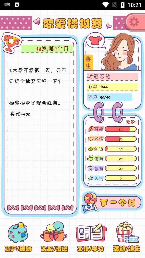 19岁6个月:通过观看广告获取礼物,以此提升父母好感度至100。苏婷婷前往游乐园,还参与了漫画社的三次活动。