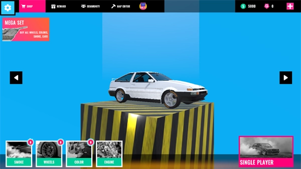 2、挑选一辆心仪的汽车,在左下角能够更换汽车的油烟、车轮、颜色、引擎等部件;