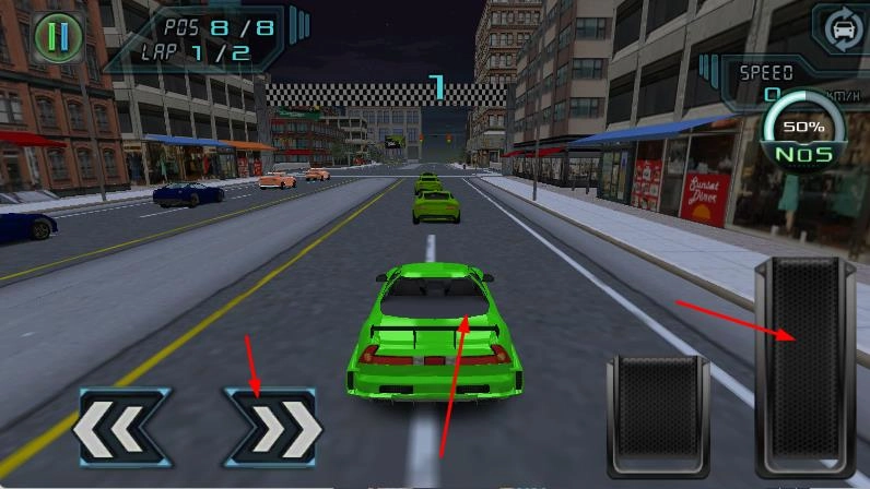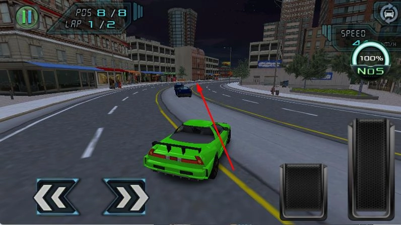 2、比赛过程里,通过左右箭头按钮来调整方向,右侧的按钮能够启用氮气加速功能,在公路赛道上完成对其他车辆的超越。
