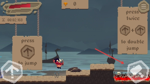 3、关卡内左侧按键控制移动与跳跃,遇到敌人时点击右侧攻击按钮,按照“按两次可二段跳”的提示跨越障碍。