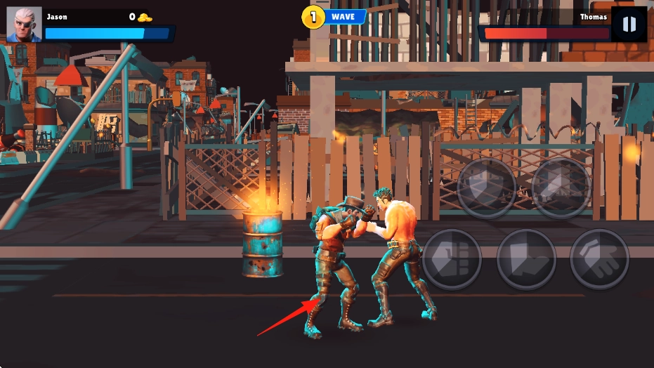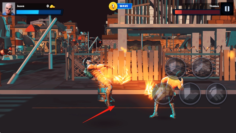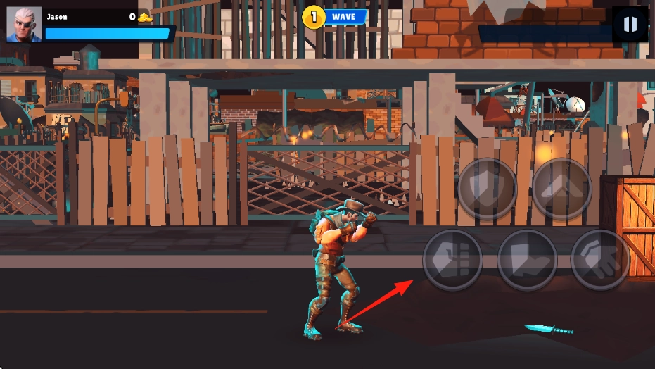 1、角色操控选择“Jason”角色,使用右侧的技能键(拳、脚、格挡),参与“1WAVE(第1波)”的战斗,战斗场景设定为废墟街道。