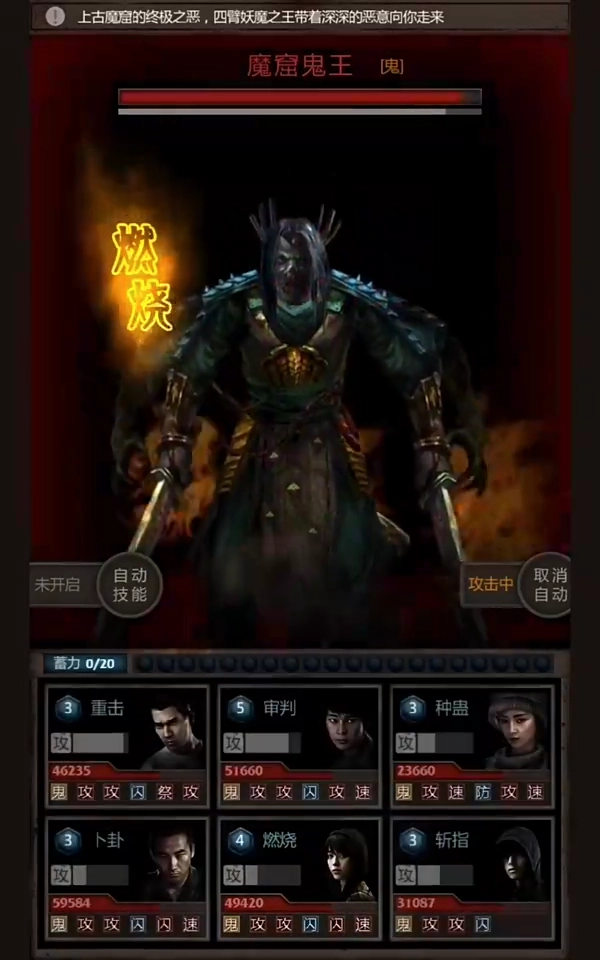 1.开局先让苗姜献祭,接着九妹必须燃烧(这一步不能省略,否则鬼王残血后会给自己套盾,届时需要破盾却完全没有条件应对,根本打不了),之后用龙斩两次来压低血线