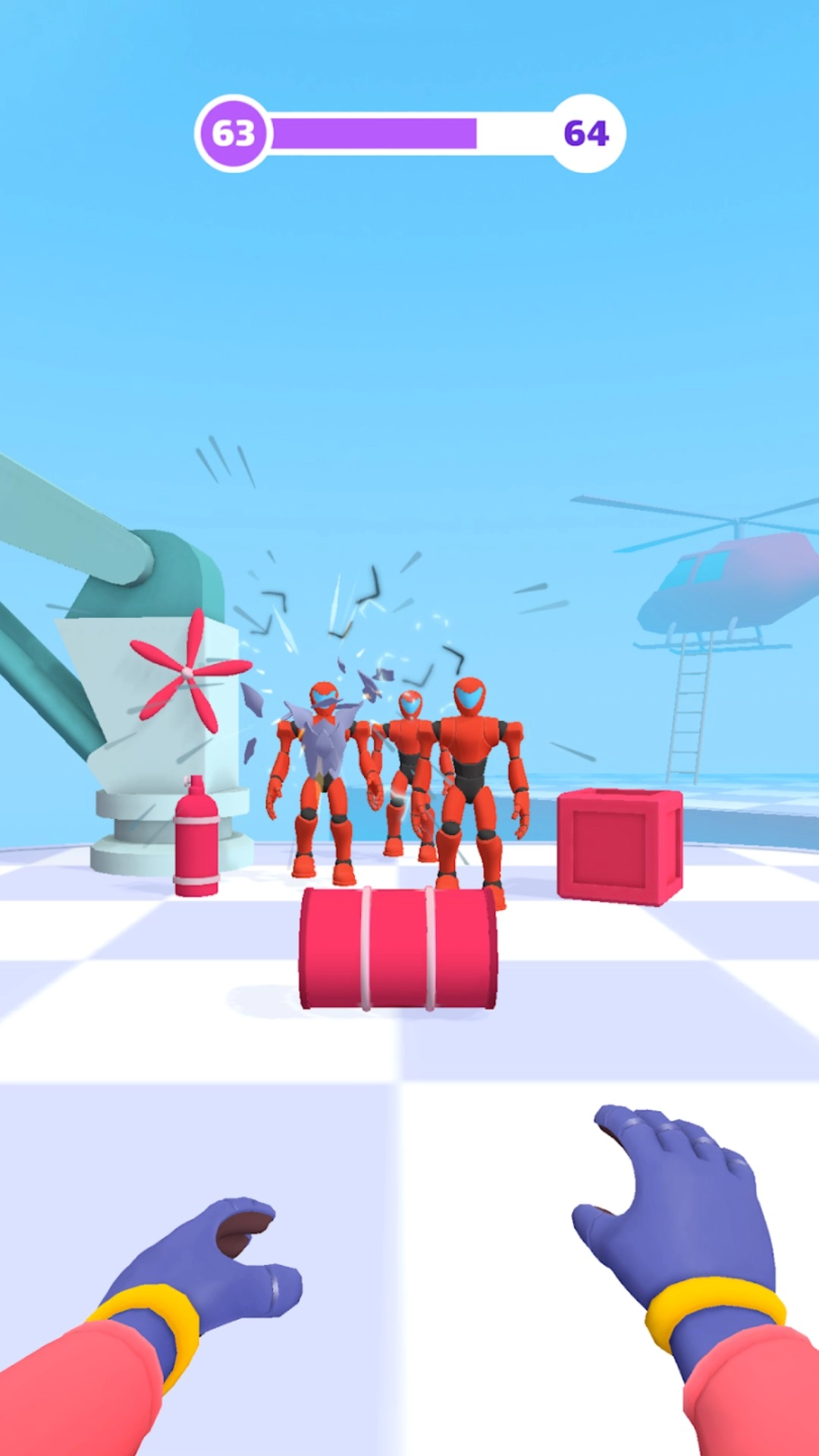 1、滑动屏幕发射磁性绳索,缠住机械守卫、电锯等目标,通过触发爆炸来清除敌人。