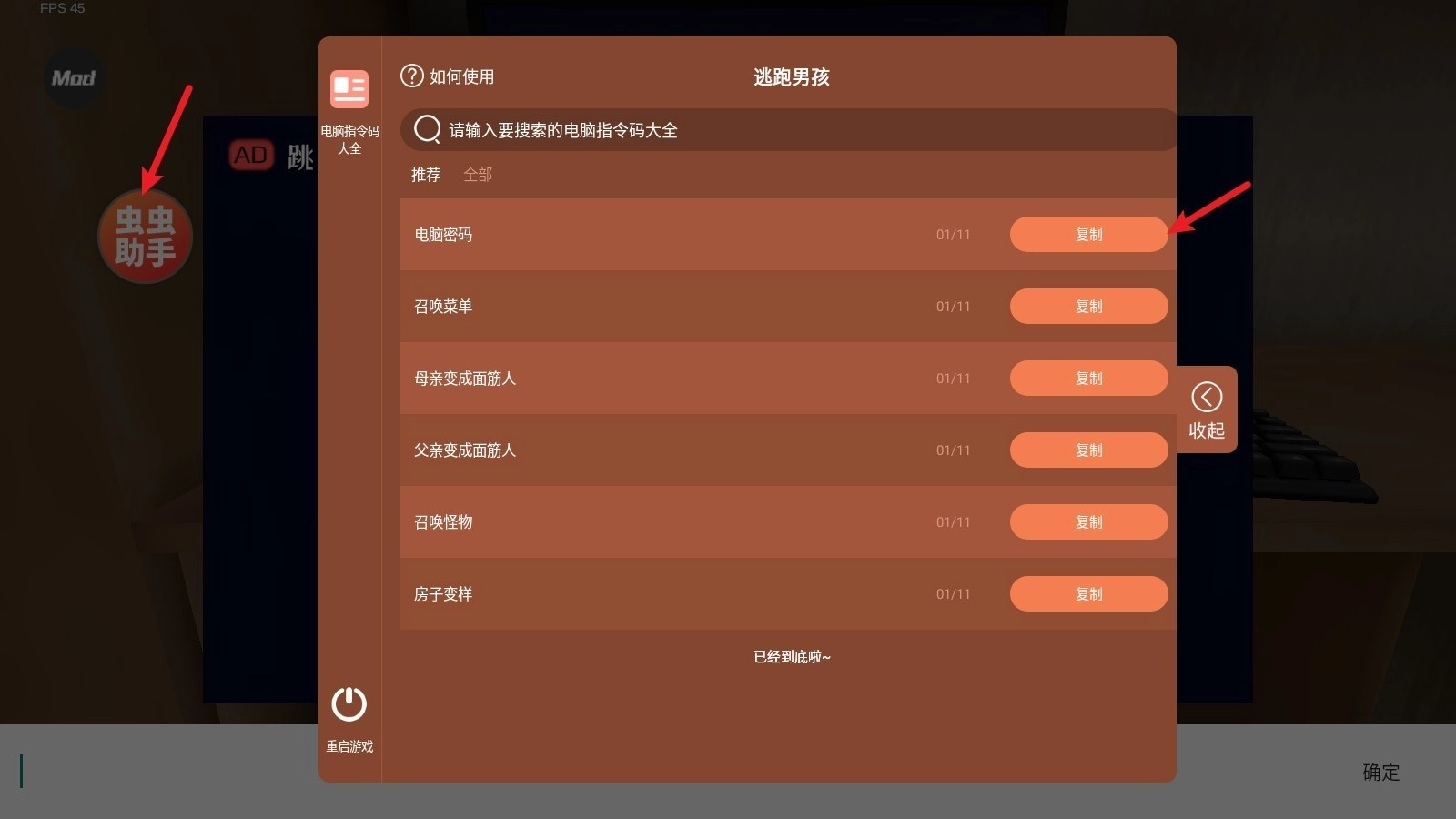 3、要是觉得输入太麻烦,或者不想手动复制粘贴,直接点击左侧的虫虫助手就行,这里面的每段代码都能一键复制。