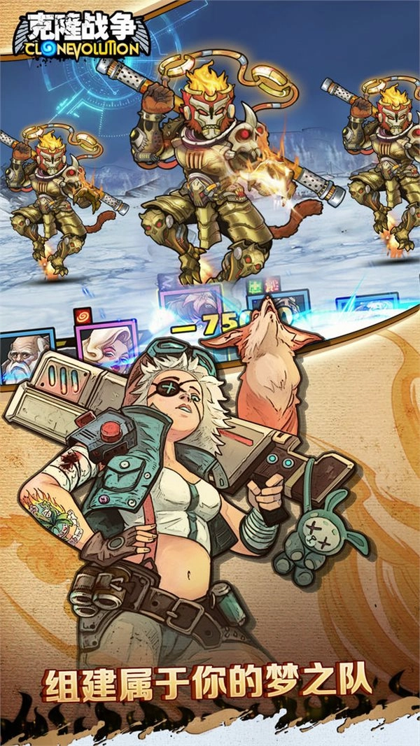 风靡海外的美式硬核卡牌游戏重磅登场!《克隆战争》这款末世废土风拉满的卡牌游戏,凭借搞怪的画风与酷炫的技能科技,将你带入别具一格的克隆世界!在这里,你能克隆出形形色色的历史英雄、明星大腕——凯撒大帝对决伊丽莎白女王,武皇帝交锋德古拉,李小龙PK埃及艳后,各路英雄开启热血大乱斗!只有你想不到,没有游戏做不到,赶紧召唤专属你的克隆英雄,消灭邪恶的克隆生化军团吧!