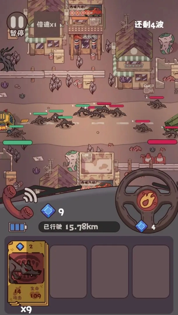 1、在行驶途中持续驾驶车辆时,能借助上下滑动的操作切换至不同车道,以此收集各车道对应的资源;当抵达道路终点后,需要与狼群展开战斗。