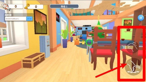 2.猫咪技能按钮:在画面的右下角设有跳跃和抓挠两个按钮,点击它们就能操控猫咪完成翻越障碍的动作,或是进行破坏类的互动,整体操作简单直观,很容易上手。