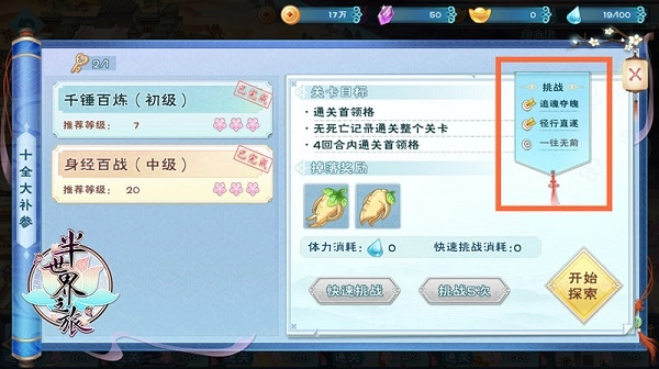 不过要是快速挑战剧情副本,就仅会提升冒险经验,不会提高伙伴经验。伙伴经验会转化为人参返还给玩家。快速挑战5次普通剧情副本要耗费25体力,能得到20个人参宝宝;快速挑战3次困难副本需消耗30体力,可获取24个人参宝宝。