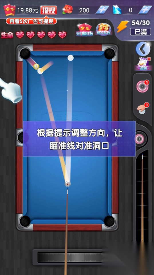 1、滑动屏幕来调整击球的方向,拖动力度条以控制击球力量,松开手指就能完成出杆动作;