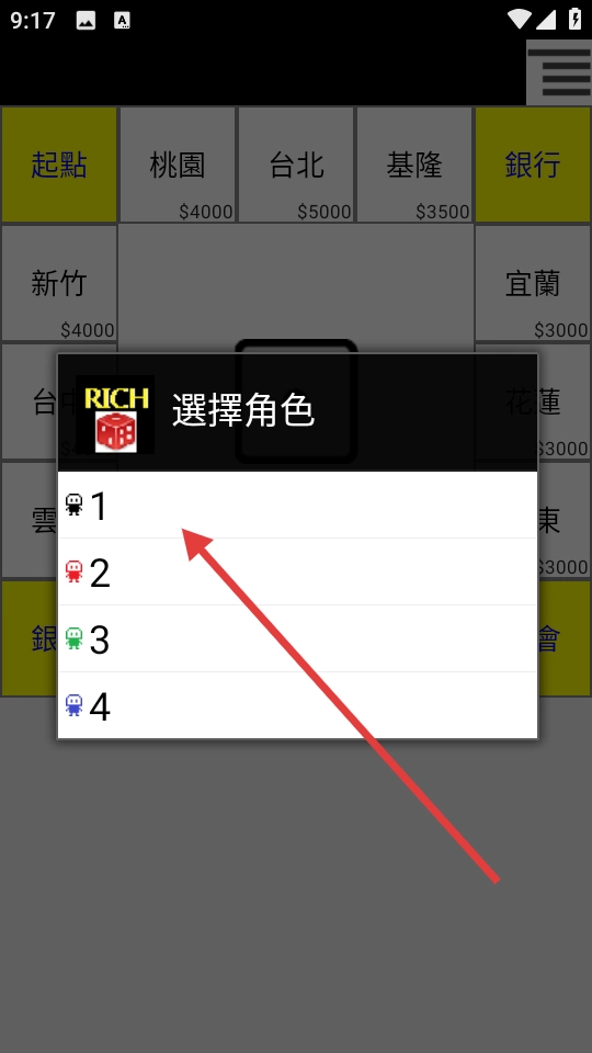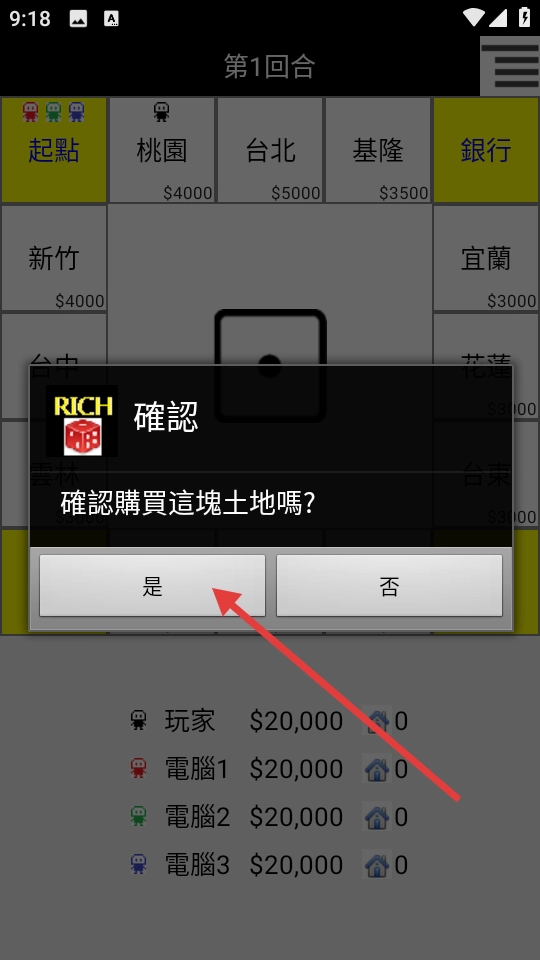 1、打开游戏即可直接开始游玩,选好角色后通过掷骰子来决定移动的步数,一旦踩中没有被占据的空地,就能插上属于自己的旗子,成为收取租金的包租公。