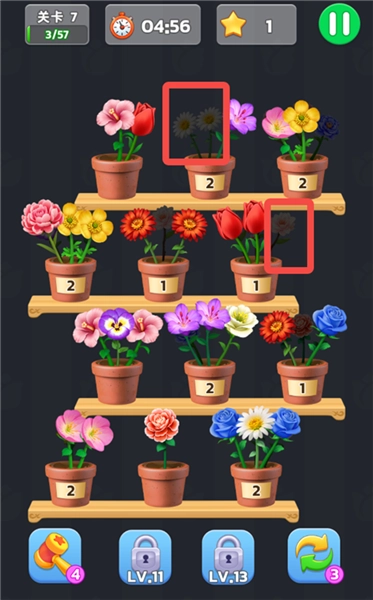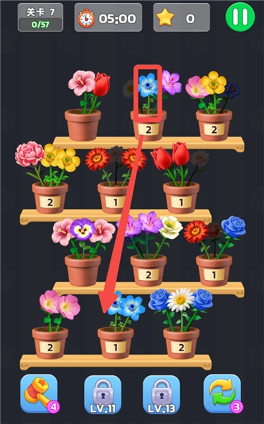 1、打开游戏,进入关卡中,要将三个相同的花放入同一花盆,将第一排中间的蓝色花放入最后一排中间的花盆,可进行消除合成。