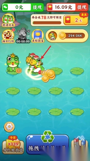 2. 拖动合成:把两只一模一样的蛙拖动到一起进行合并,就能升级成更高级别的蛙。
