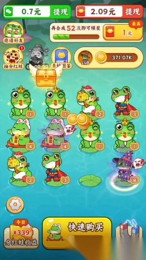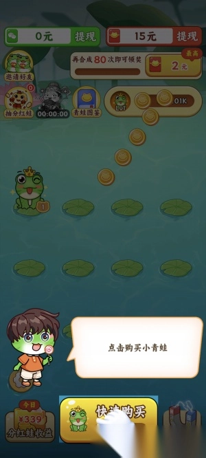 1. 购买青蛙:消耗金币购买初级蛙蛙,系统会随机生成并将其投放至池塘;