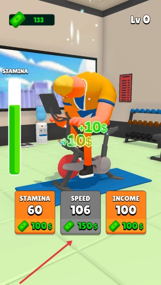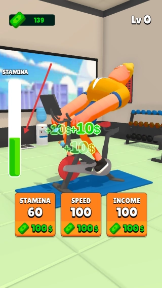 1、进入游戏后,按照【Tap and Hold】的提示操作,长按屏幕就能让角色在健身车上开始运动,同时消耗耐力(STAMINA)。