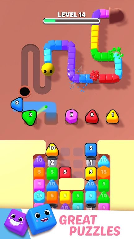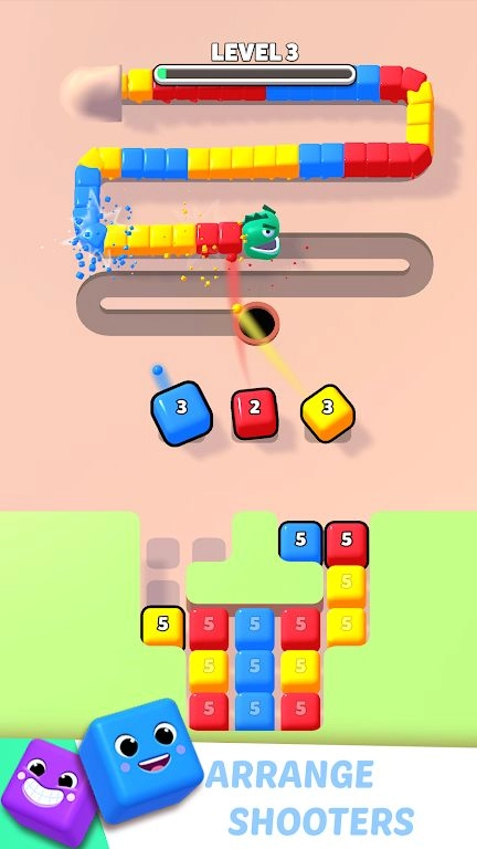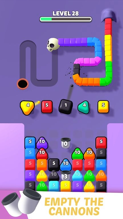 2.色彩鲜亮的方块蛇与攻击瓷砖增强了画面的视觉冲击力,趣味十足的射击及消除音效,让每一次攻击都洋溢着畅快的体验。