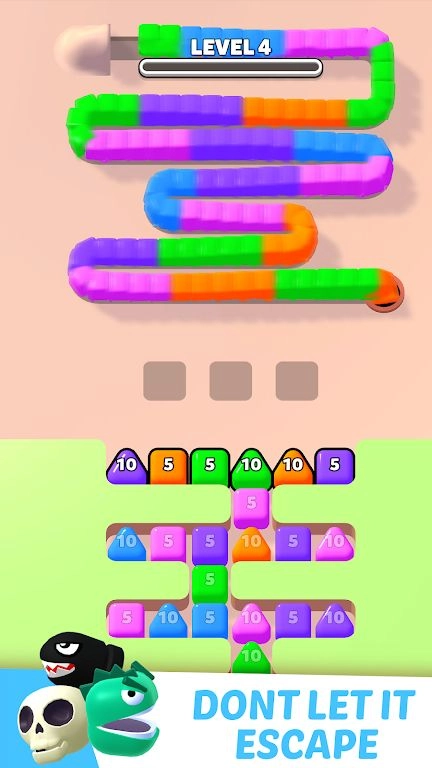 2. 随着关卡的逐步深入,方块蛇会随机生成更为复杂的颜色序列,有时还会出现分裂、加速之类的特殊行为,以此持续保持游戏的新鲜感。