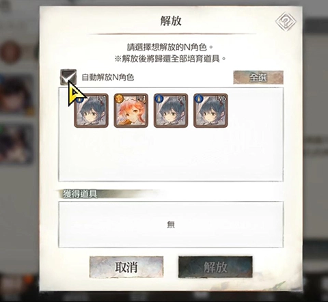 2、这款游戏里N卡没什么用,能升级的卡只有R卡和SR卡。刚开始会赠送水、土、风属性的角色各两名,还有一名光属性角色。