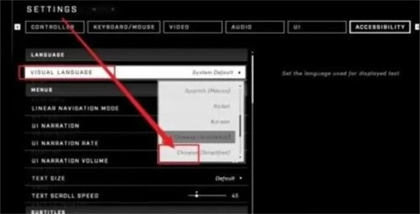 3、接着点击VISUAL LANGUAGE(即语言功能选项),找到其中的CHINESE(即中文选项),点击它就能完成切换了。