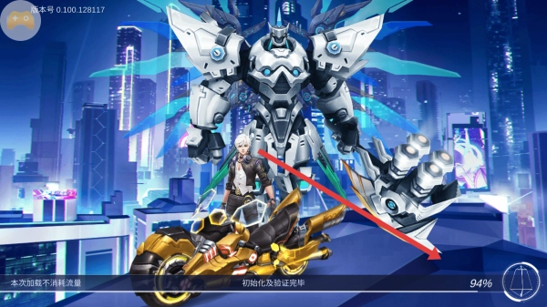 1、待“初始化及验证完毕”(进度达94%)后进入游戏,操控机甲角色在未来都市中展开探索,亲身体验战斗玩法。