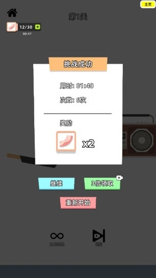 3、玩家只需轻触几次屏幕就能轻松通过一个关卡,玩法看似简单,玩起来却相当让人沉迷,尤其是培根掉落时的搞怪音效,让人忍不住多听几次,然后继续玩下去。