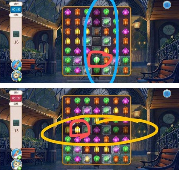 先消除任意颜色且数量≥6的灯后,会随机生成一个横向或竖向的特殊灯泡;接着消除带有该特殊灯泡的灯(需满足消除时数量≥3),就能消除一整横排或一整竖排(注意:消除带有特殊灯泡的灯时,最后一个连接的灯将决定消除的行或列;若存在两个相同颜色的特殊灯泡且一个为横向、一个为竖向,则会形成十字形消除效果)