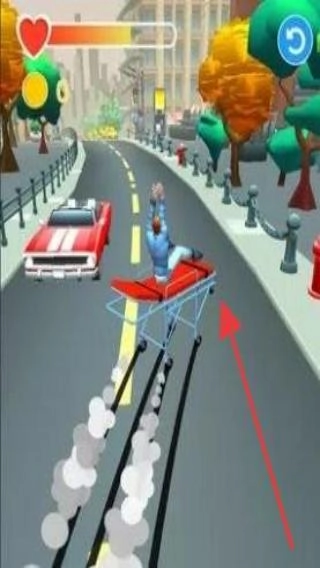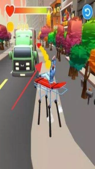1、通过左右滑动来操控担架,躲避红色跑车与绿色货车,确保角色的血量(爱心条)维持在安全状态。