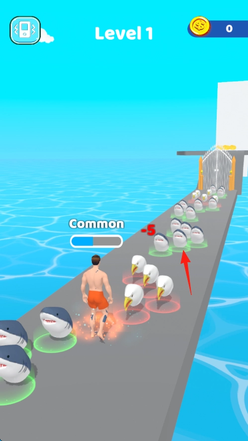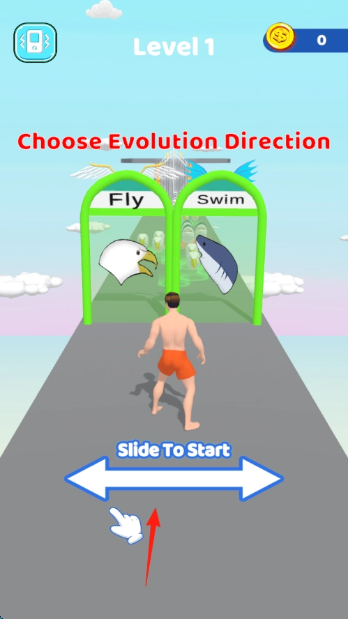 3、进入第二关后,通过组合吞噬鲨鱼与海鸥,解锁全新形态,随后冲刺向终点大门,完成进化并开启下一关。