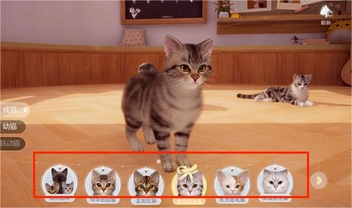 1、游戏初始会进入猫舍场景,其中展示中华田园猫、孟加拉猫与美短等多个品种。