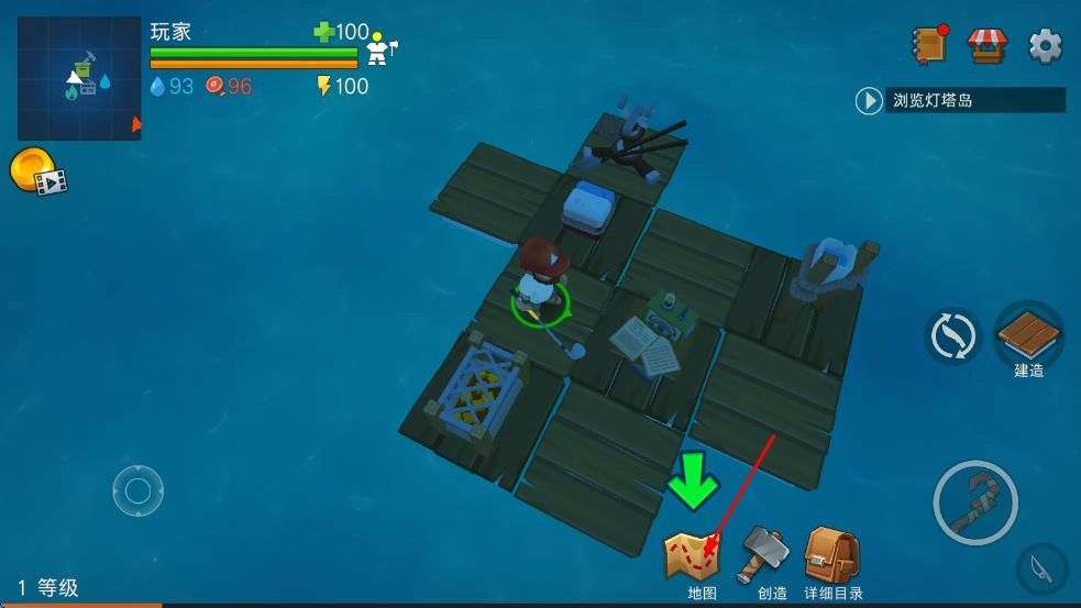 进入游戏后,操控角色在初始木筏上利用钩子收集漂浮的物资,制作基础工具与生存道具,以此维持角色的生存状态。