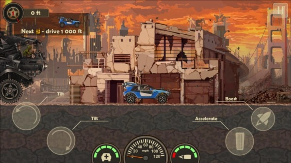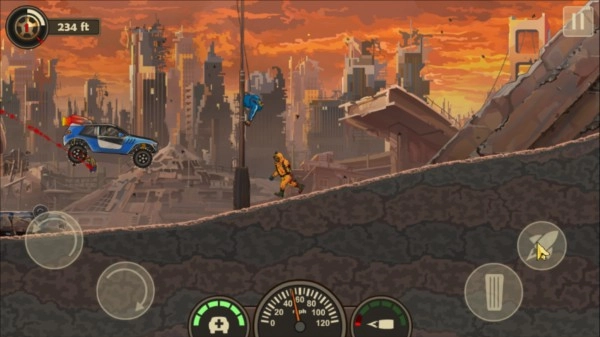《战车撞僵尸3》中文版同样采用闯关玩法,不过单关流程相当长。好在游戏在每一关都设置了三个记录点,这个设计挺贴心的——要是不想从头重玩,就得赶紧抵达下一个记录点。等我们通过这三个记录点,就能解锁下一关了。 游戏操作也很简单:左边按钮用来控制车头翘起和车尾翘起;中间是仪表盘和油量显示,得时刻留意油量才能跑得更远;右边是加速键,相当于油门,基本要一直按住,不然没在规定时间内到达目标,这局游戏就结束了。