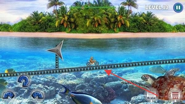 2、在海洋与海岛主题的赛道上,通过“Gas”键实现加速、“Brake”键进行减速,同时控制摩托的平衡状态,顺利通过环形轨道与波浪形轨道。