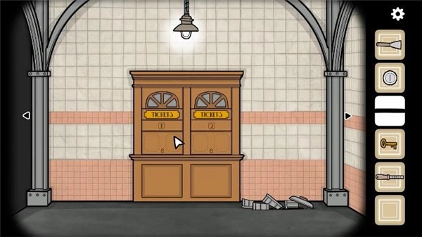 11、接着我们来到垃圾桶旁的售票处,用钥匙打开门,再用水管敲了敲门框,把售票员叫醒后和她沟通,表明我们需要一枚硬币。