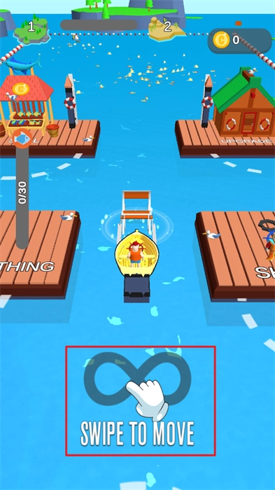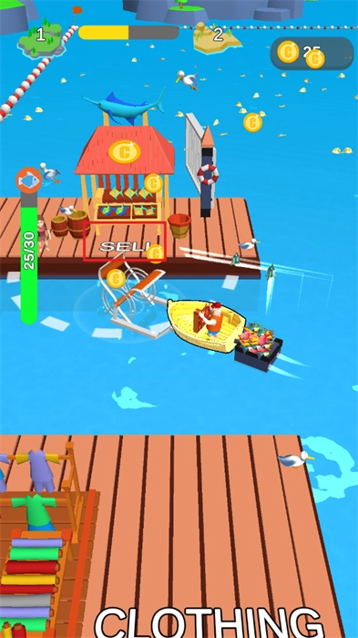 6、划动自己的渔船驶向交易地点,将船上的各类小鱼售卖出去,从而获取金币。