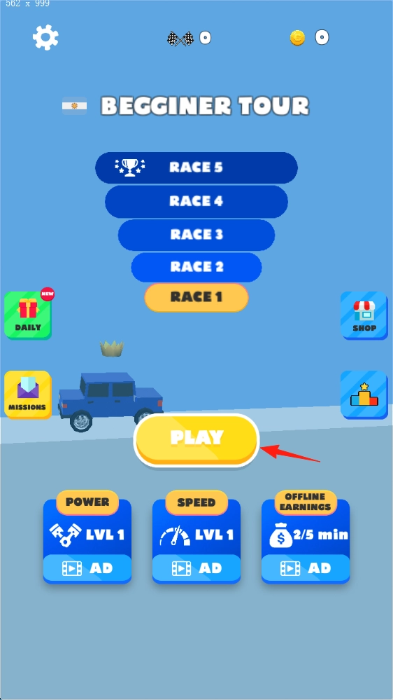 1、点击标有红箭头的【PLAY】按钮,进入RACE1关卡。在此关卡中,你需要操控蓝色汽车,在彩色赛道上完成跳跃动作,同时收集皇冠道具,以此熟悉游戏的基本操作方式。