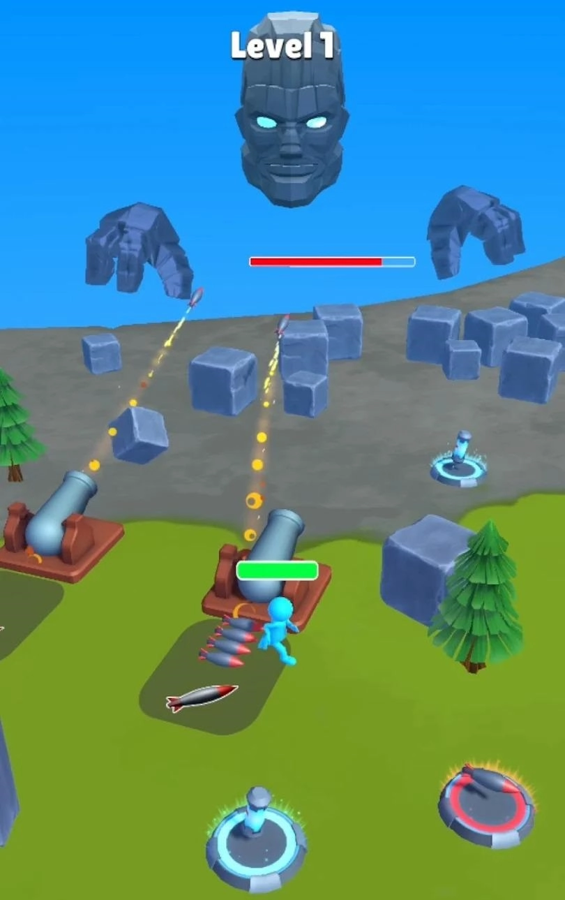 1、自由滑动屏幕来操控角色,一边躲避石像的攻击,一边收集炮弹;
