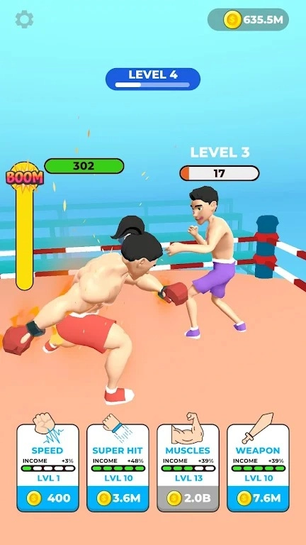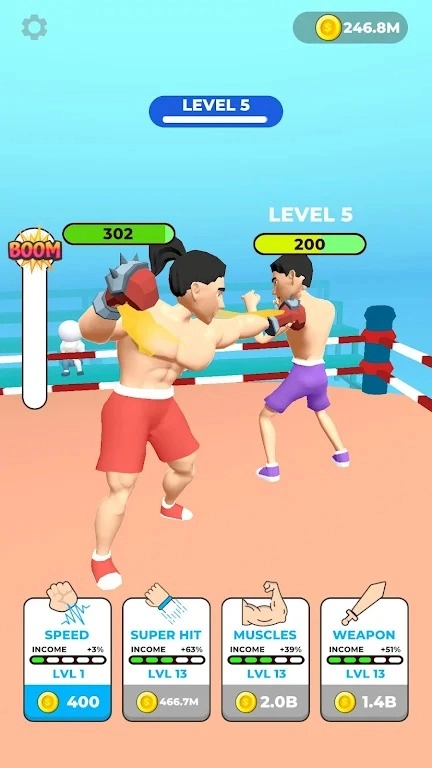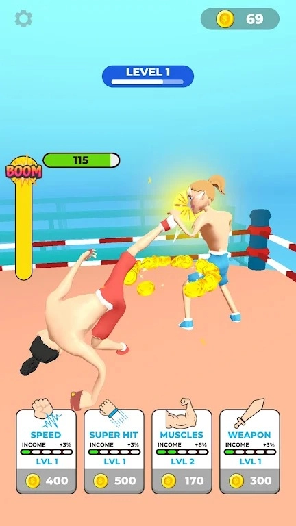 1. 玩家需快速点击屏幕来操控拳击手出拳,无论是击中沙袋还是对手都可获取金币,点击的速度越快,所能得到的收益就越高。