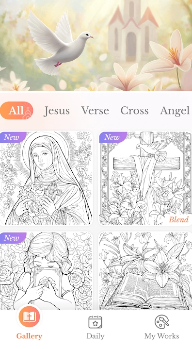 我的圣经填色游戏为人们提供了在繁忙日常里亲近神话语的特别方式。玩家通过给精心设计的图案填充缤纷色彩,既能探索灵性世界,也能激发创造力。不管是在家中享受静谧时光,还是在旅途中寻觅片刻安宁,这款游戏都能成为心灵的休憩之所。每一幅图案都藏着深刻的含义,助力玩家在创作中寻得内心的平静,在色彩的天地里体会上帝的同在。