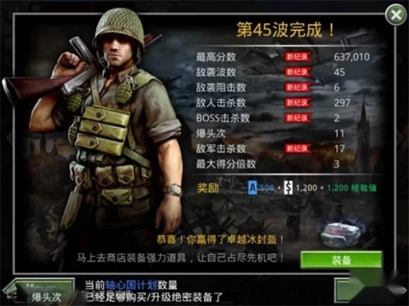 5、耐心等待卓越品质的冰封头盔,同时积累超过200颗手雷。战斗时以手雷为主要输出手段,搭配超级士兵协同作战,推进到第45关。此时角色血量约为400多,而装备冰封头盔后,血量可直接提升至8000以上。