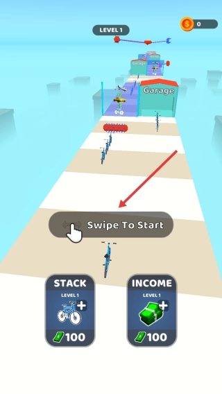 1、滑动【Swipe To Start】区域,控制蓝色自行车队列,沿着赛道行进,避开尖刺等障碍物。