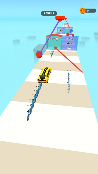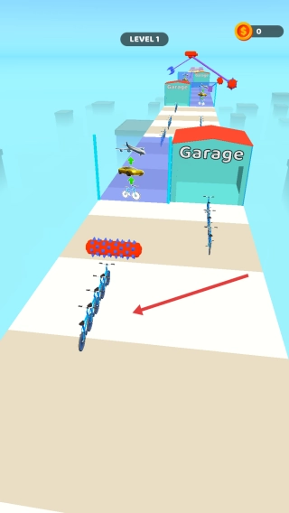 2、把颜色相同的自行车合并堆叠起来,升级成汽车(比如黄色的车),然后冲过【Garage】终点。