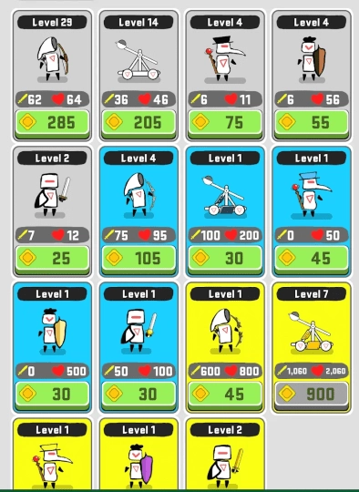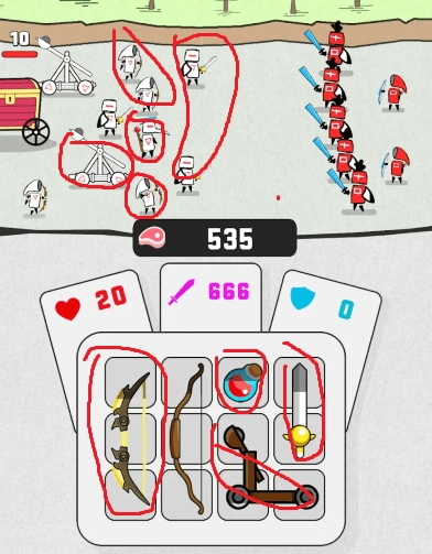 在看这一组的,你有两把弓箭,而且它们还不一样,上面出现的兵种也都是两种不同的,连投石车都配备了。那个长得像药瓶的是负责加血的职业,你看到中间拿着法杖的就是它。这个组合里没有盾牌兵,蓝色的文字是不带数值的。