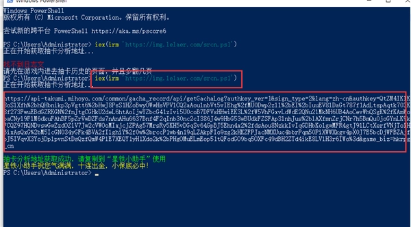 复制下方段落来获取抽卡分析的链接,接着按下回车键执行iex(irm 'https://img.lelaer.com/srcn.ps1') 即可。