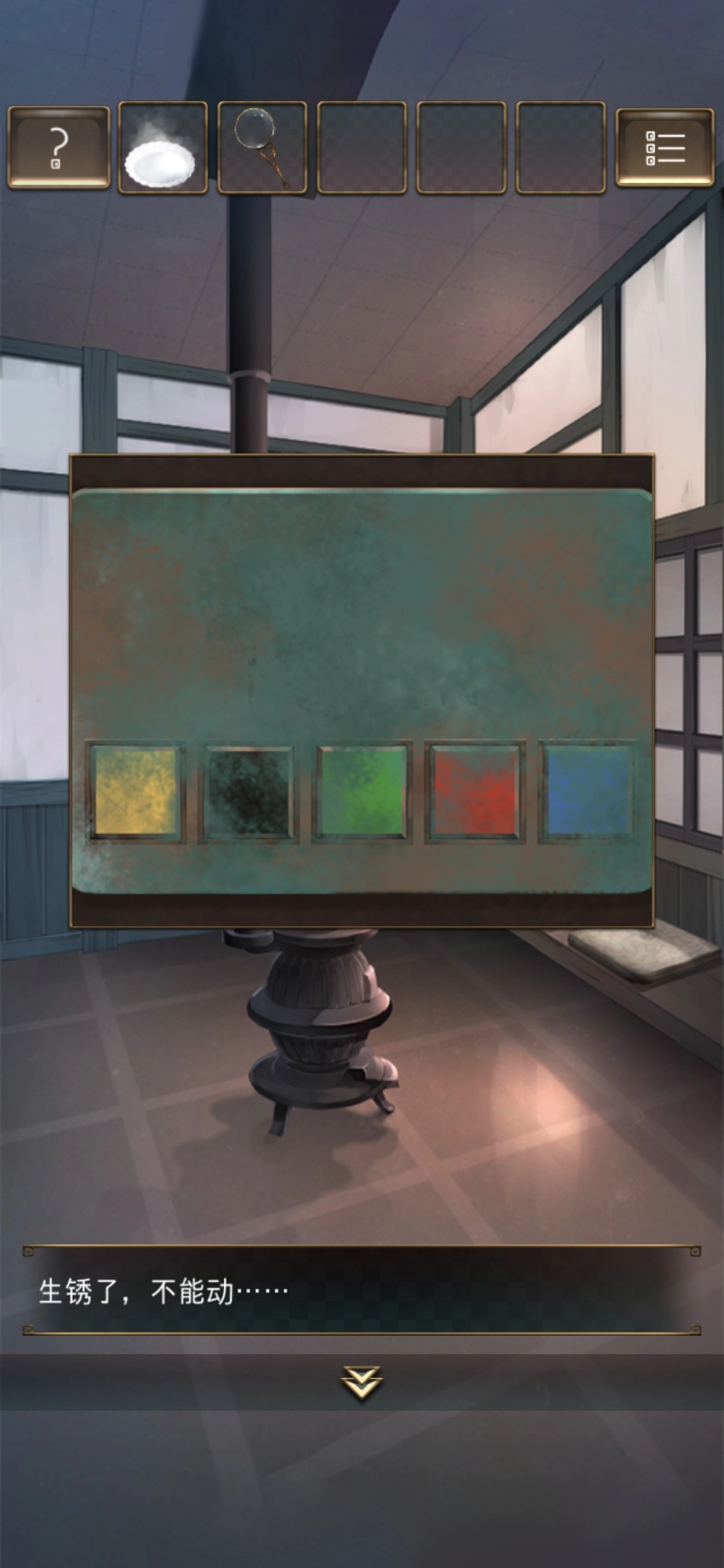 5.向左行至候车厅,找到垃圾箱后,参照拼图上的图案,按顺序点击圆点,打开垃圾箱即可获取【钥匙】。