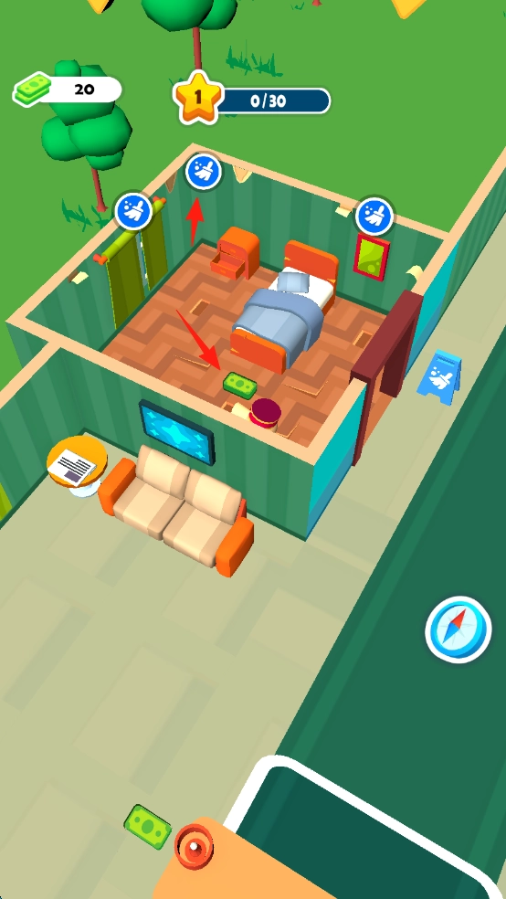 3、按照红箭头指示进入客房,清理杂物(例如修复图标),并收集房间内的金币,完成“0/30”的任务进度,以此推动酒店星级从1星向更高等级升级。