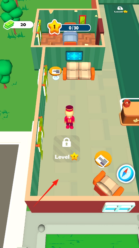 1、操控角色(红箭头标识),在酒店场景内进行探索,当靠近“Level4”区域且达成指定条件(例如收集20枚金币)时,即可解锁新的楼层。