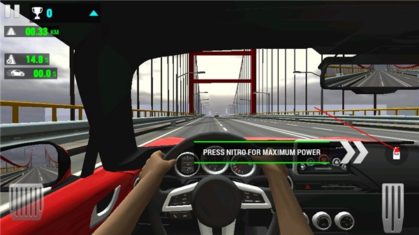 1、在本站安装并启动赛车限制游戏,进入游戏界面。右侧的按钮为油门,点击该按钮即可实现加速操作。