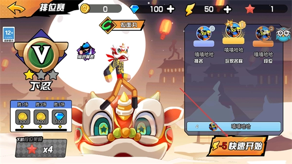 3、进入排位赛界面,选择当前拉面丸角色,点击快速开始参与排位对战,胜场可获取钻石等对应奖励。