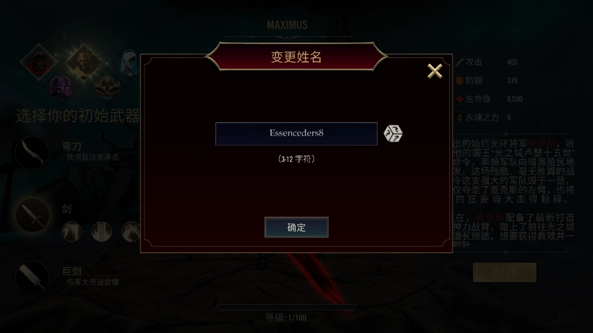 2、进入游戏后,挑选初始武器,创建专属于自己的角色,并设置游戏名称。