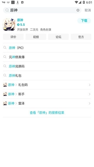 2、接着点击首页右上方的搜索图标,输入游戏名称(例如原神),该游戏的相关信息便会呈现出来。