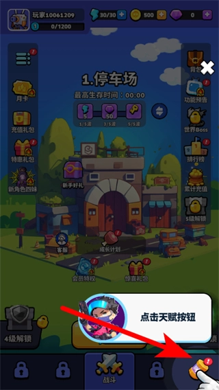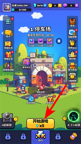 3、回到主界面后,点击“开始游戏”按钮,消耗相应资源即可进入1.停车场关卡开始战斗。